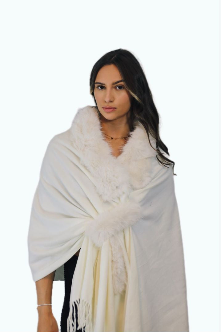 This lightweight faux fur shawl is designed to keep you warm without compromising on style. There are several ways to wear it, such as tying it yourself or adding a belt for an even more fashionable look. The top edge is decorated with faux fur, providing extra warmth and protection against the wind. The main part of the shawl has a luxurious cashmere-like feel, ensuring softness and comfort. Perfect for any chilly day, this shawl combines elegance and functionality, making it a versatile addition to your wardrobe. Stay cosy and chic with this must-have accessory!